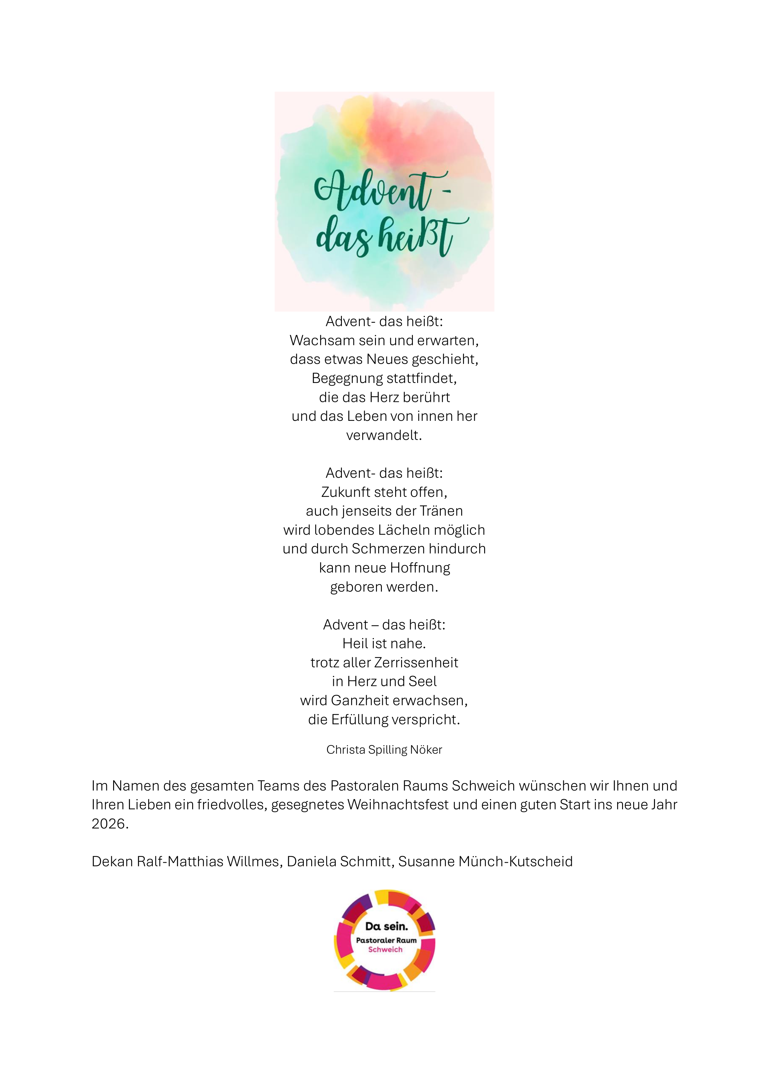 Weihnachtsgrüße des Teams des Pastoralen Raums Schweichs